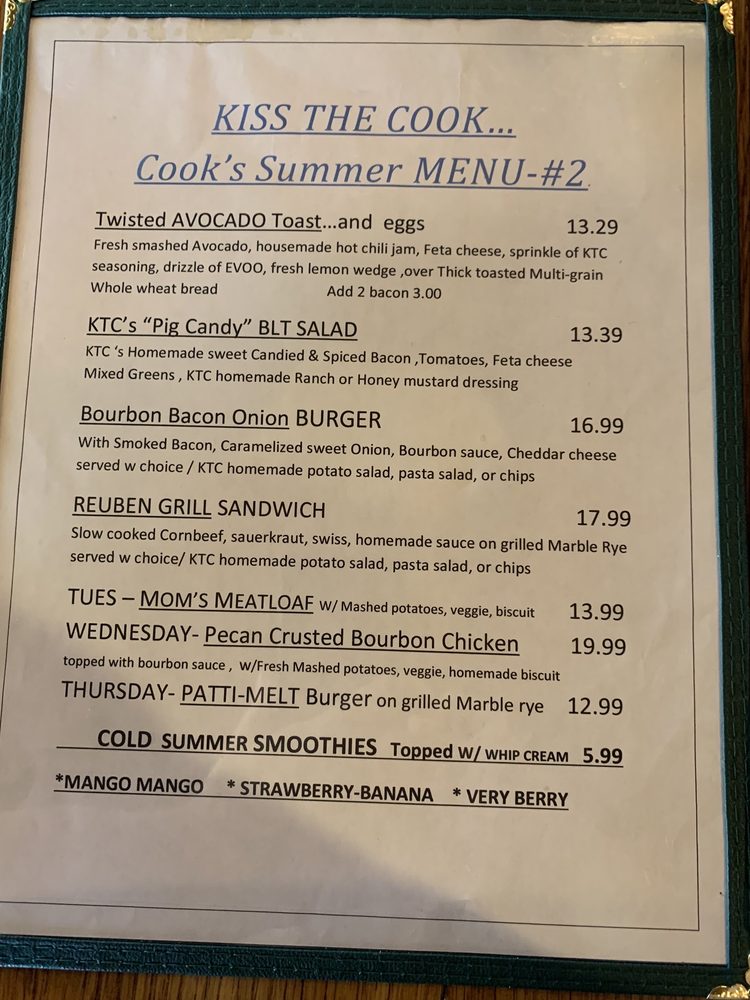 Ask about today's pie. Whole pies can be ordered (24 hour notice for most of our pies) sometimes same day is possible ( must call KTC directly FIRST ) Fruit pies, Apple, Sour cream French Apple with crumb topping, Cherry, Blueberry, Peach , Sugar free Apple ,Sugar free Blueberry, and Cream pies Chocolate, Coconut, Banana, and Dad's Coconut-banana, Pecan, Bourbon Pecan, Pumpkin, Key lime, Lemon Meringue... (Seasonal Rhubarb,(MAY,JUNE) Fresh Pumpkin OCT.,NOV), just to name a few call for the whole list. Prices 35.00-40.00... So if your grandma made it we can recreate it for you ,please just let us know your favorite with a little notice we can do it for you. Give a pie as a house warming, gathering, or tonight's dinner ! Make someones day a little more special!!